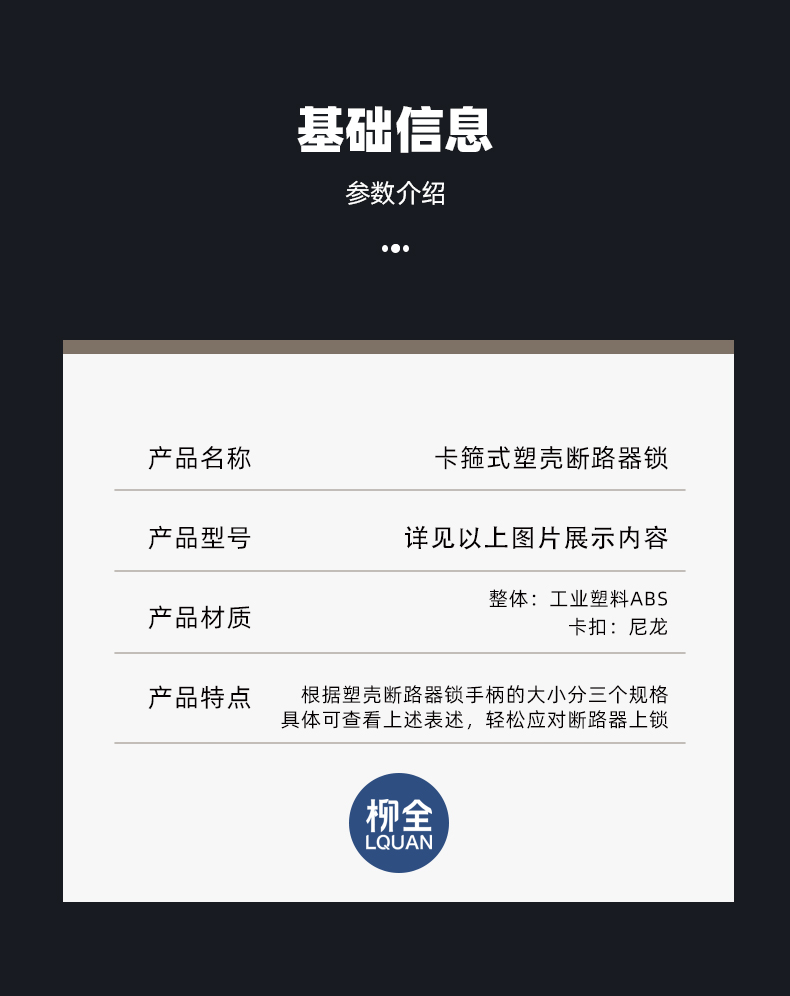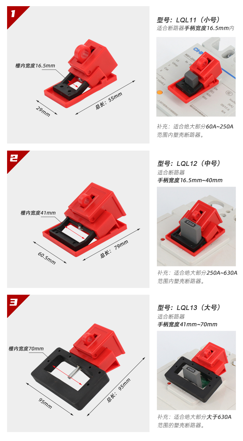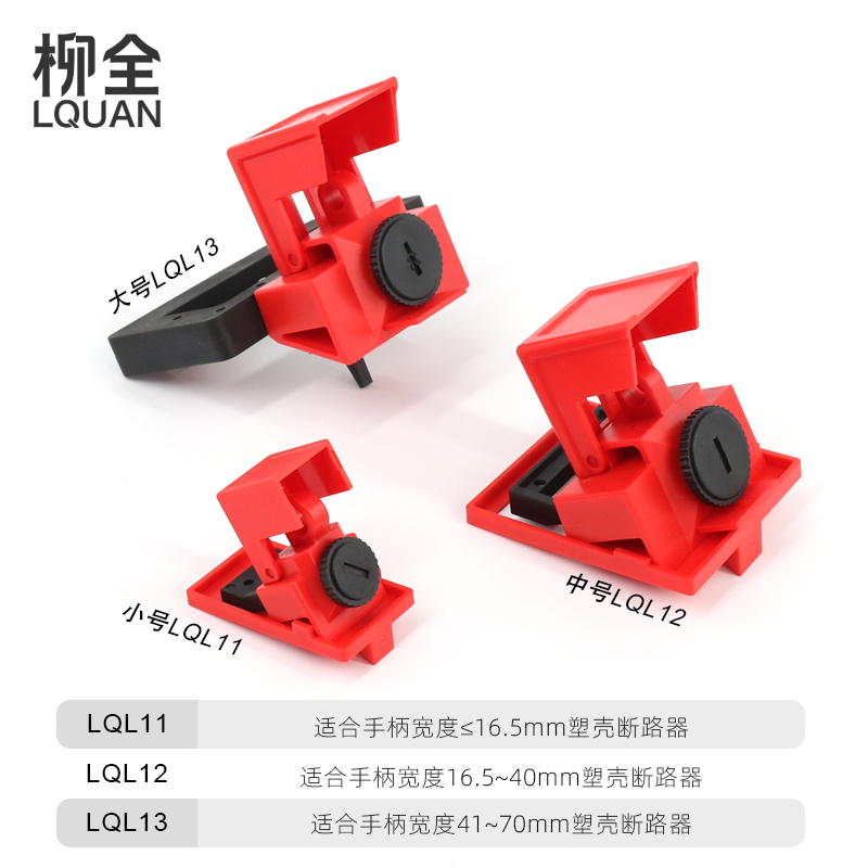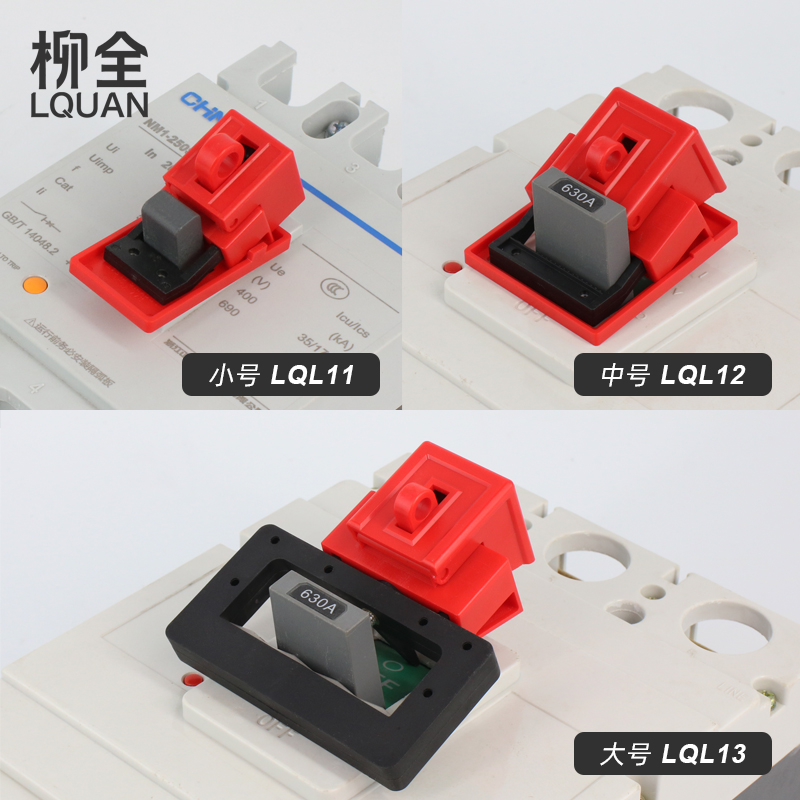 卡扣:尼龙规格型号LQL11 (小号:适合断路器手柄宽度16.5mm内)LQL12 (中号:适合断路器手柄宽度16.5mm~40mm内)LQL13 (大号:适合断路器手柄宽度41mm~70mm内)