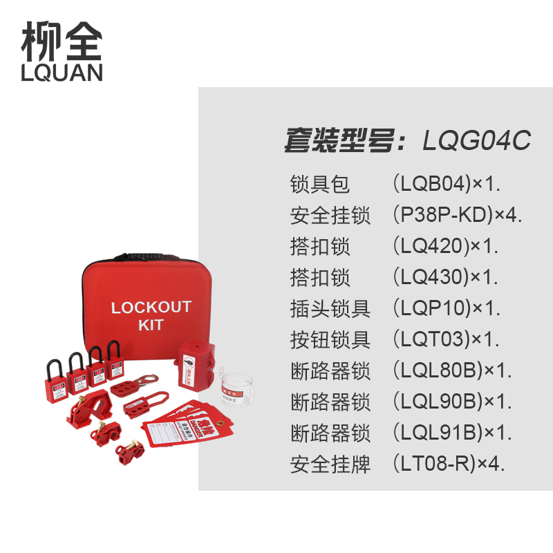 包含如下:锁具包(LQB04)*1PCS安全挂锁(P38P-KD)*4PCS搭扣锁具(LQ420)*1PCS搭扣锁具(LQ430)*1PCS插头锁具(LQP10)*1PCS按钮锁具(LQT03)*1PCS断路器锁(LQL80B)*1PCS断路器锁(LQL90B)*1PCS断路器锁(LQL91B)*1PCS安全挂牌(LT08-R)*4PCS