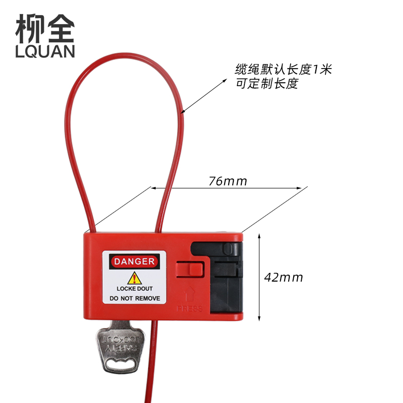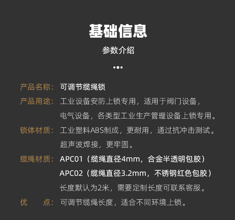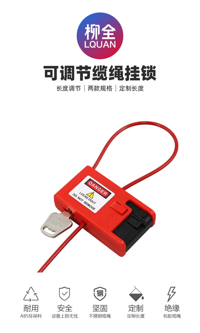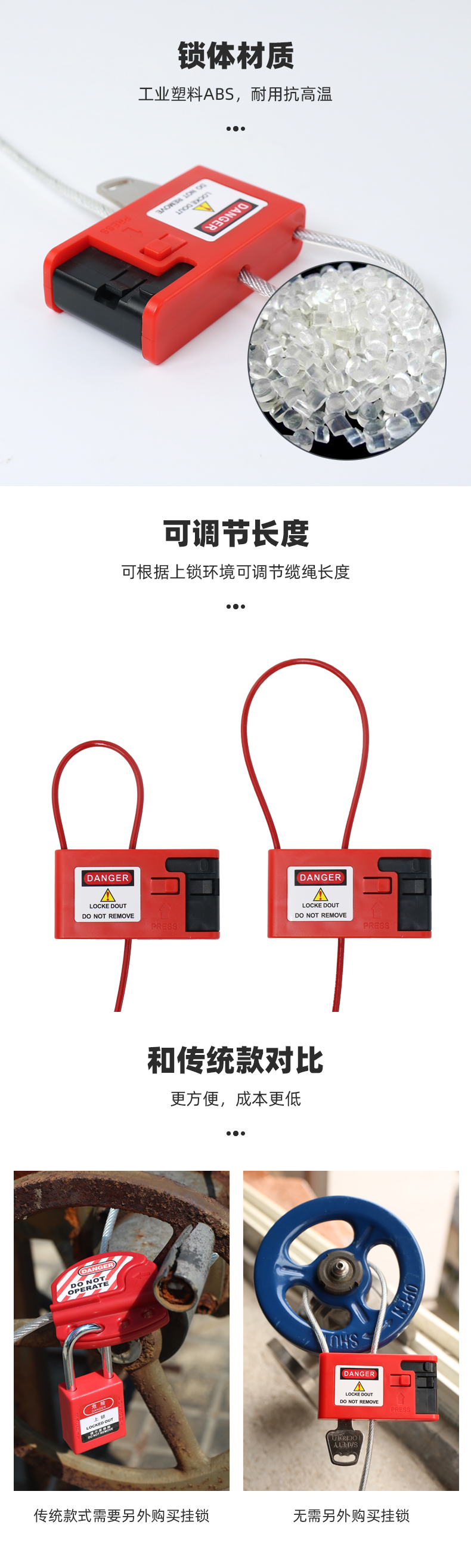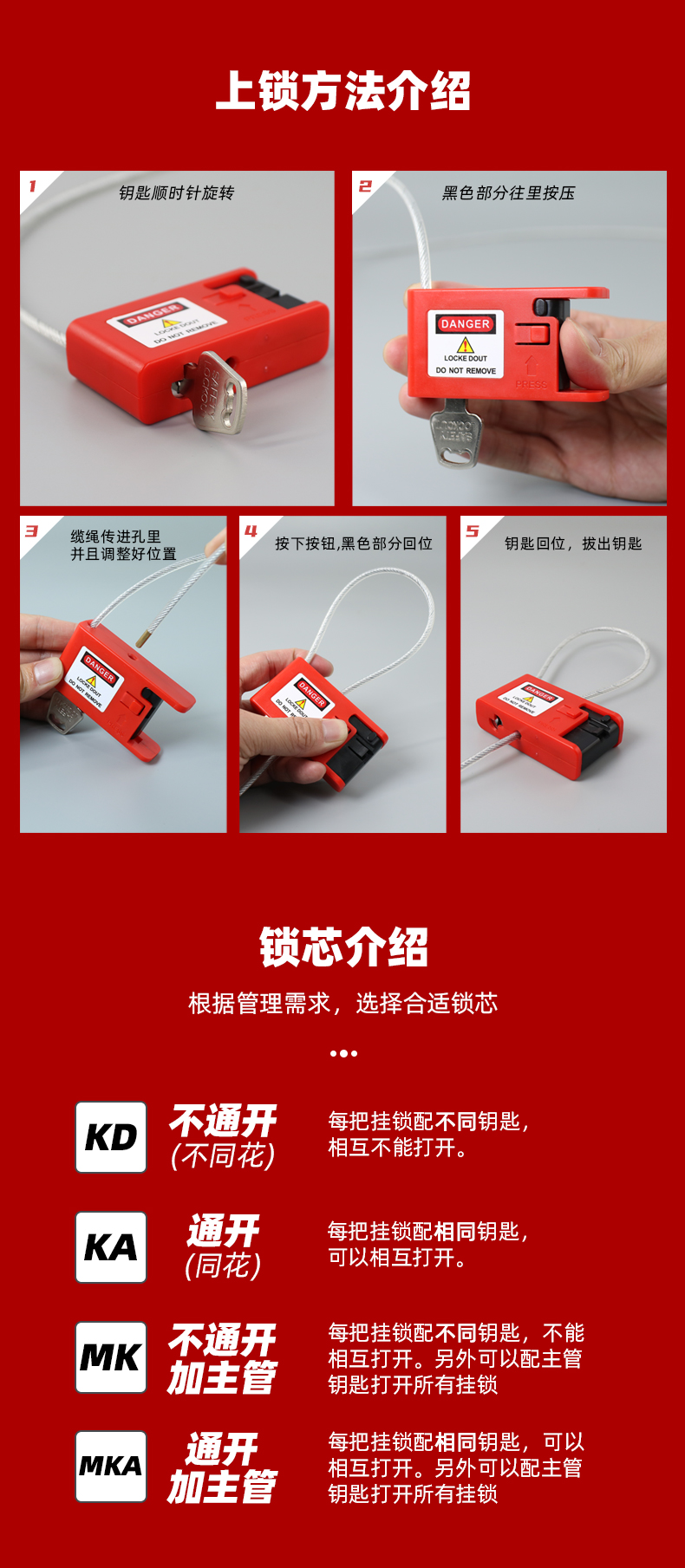 产品特点可调节上锁位置,自带锁芯,可直接上锁可定制缆绳长度