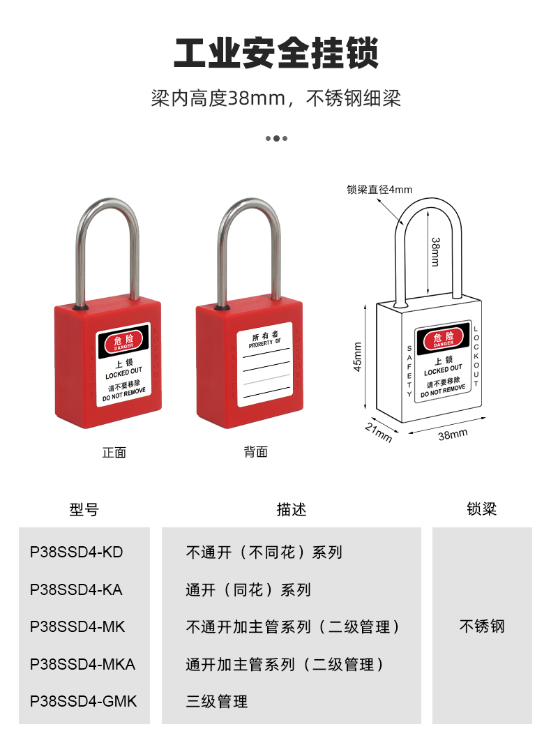 锁粱:尼龙PA产品尺寸高*宽*厚(整体)89mm*38mm*21mm 锁梁直径4mm,锁梁内高38mm