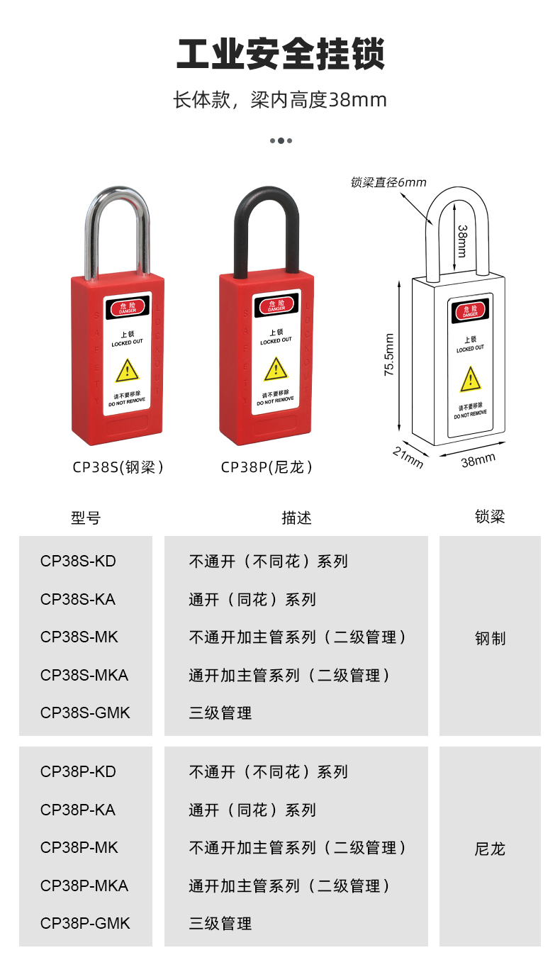 锁粱:钢粱,尼龙PA产品尺寸高*宽*厚(整体)119.5mm*38mm*21mm 锁梁直径6mm,锁梁内高38mm