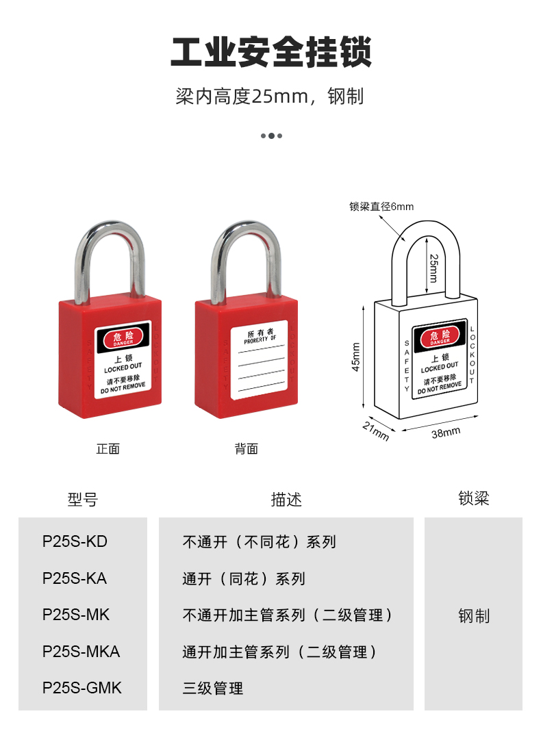 锁粱:钢粱产品尺寸高*宽*厚(整体)76mm*38mm*21mm 锁梁直径6mm,锁梁内高25mm
