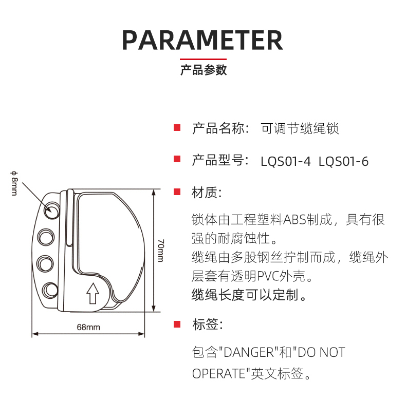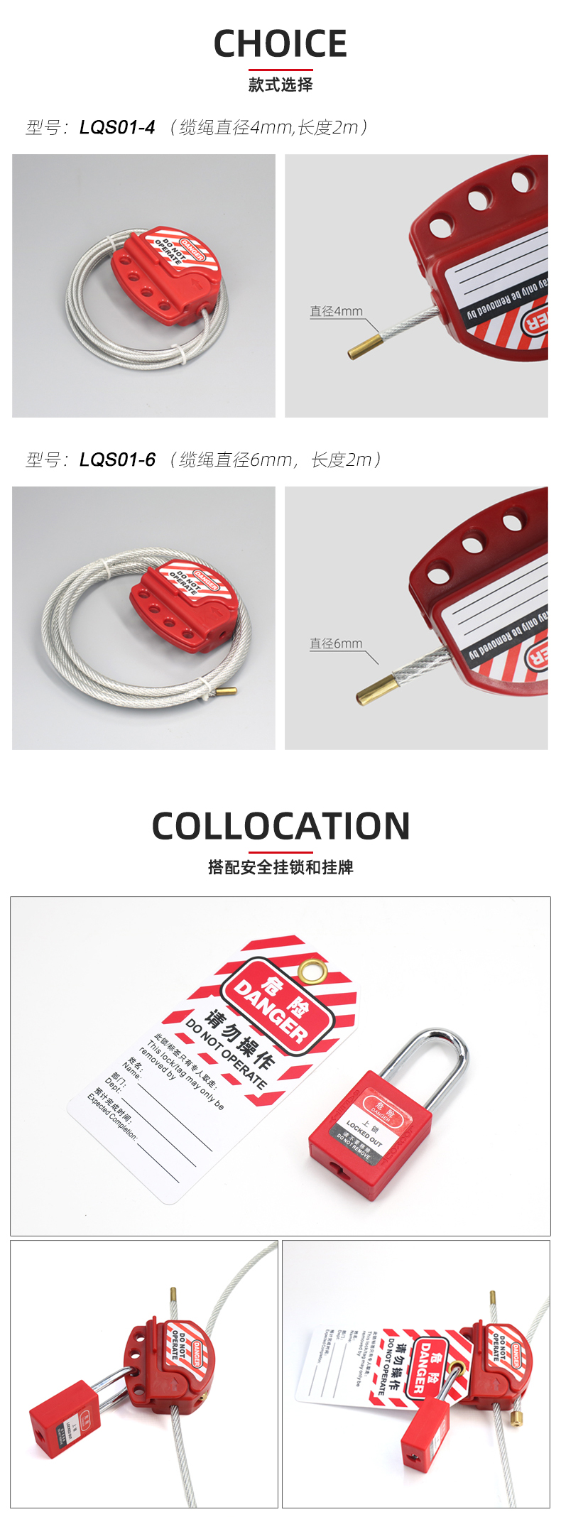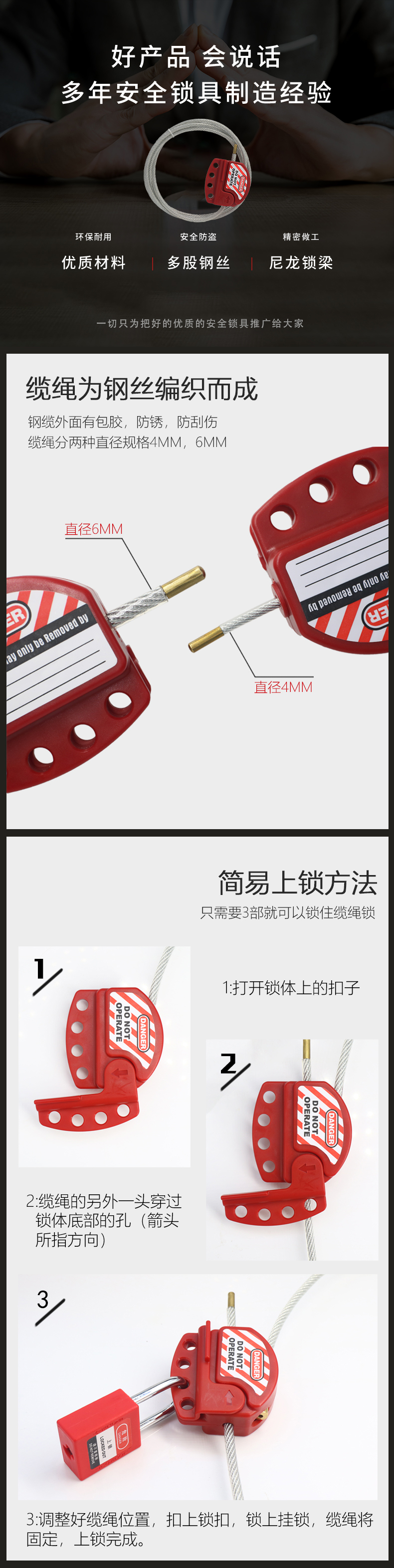 产品尺寸长*宽(锁体)70mm*68mm锁孔8mm产品规格LQS01-4(缆绳直径4mm,长度2m)LQS01-6(缆绳直径6mm,长度2m)